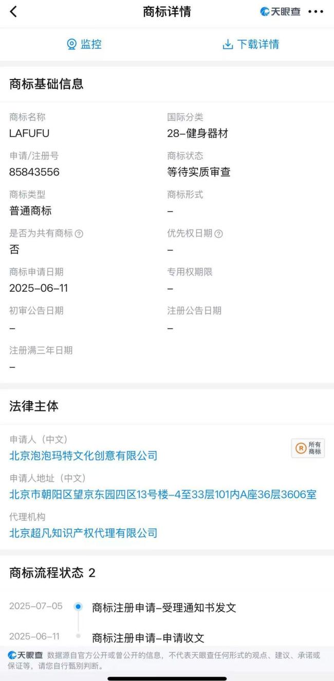 7月7日,天眼查商标查询信息显示,北京泡泡玛特文化创意有限公司于6月11日申请注册了“LAFUFU”商标,国际分类为健身器材,当前商标状态为等待实质审查。据知情人士透露,LAFUFU商标属于主动防御性注册,目的是为了更好地打击侵权行为